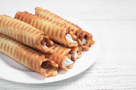 Wafer rolls with cream in plate on white wooden table. Homemade baking