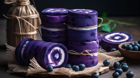 Blueberry roll cake on rustic wooden background, selective focus.