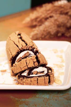 Roll dessert with mascarpone cheese and nuts in a biscuit.