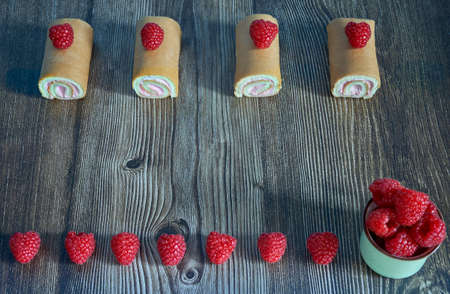 Roll cake with cream and strawberries on a wooden plate on a table