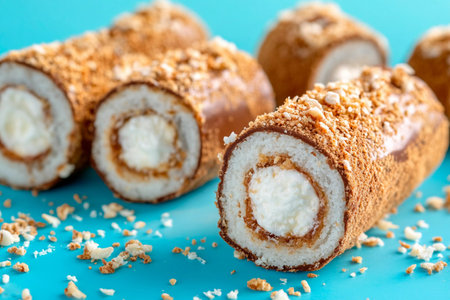 A delightful dessert featuring rolled pastry filled with a creamy center and generously coated in crushed nuts. Set against a bright blue background, it looks irresistible and inviting.