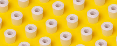 pattern from rolls of white toilet paper over yellow background, panoramic image