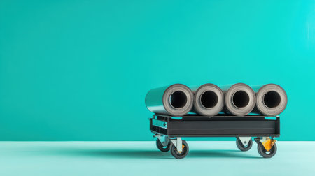 This image features four rolled materials placed on a cart, set against a vibrant teal backdrop. The modern and minimal aesthetic reflects organization and creativity in any workspace or artistic environment.