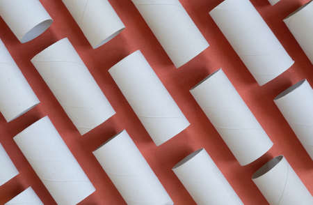White cleaning paper rolls in several rows. Sanitation and cleaning concept background. Selective focus.