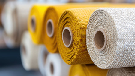 Close-up of decorative fabric rolls in cream and yellow shades, ideal for interior design