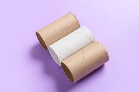 Empty toilet paper roll on colored background. Recyclable paper tube with metal plug end made of kraft paper or cardboard.