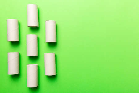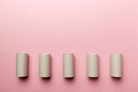 Flat lay composition with empty toilet paper rolls and space for text on color background. Recyclable paper tube with metal plug end made of kraft paper or cardboard.