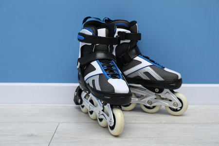 Pair of roller skates on floor near light blue wall