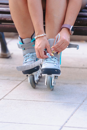 Person tying roller skate laces on street bench, preparing footwear.Vertical