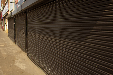 Corby, United Kingdom. April 18, 2019 - Street view of roller shutter doors, shops display