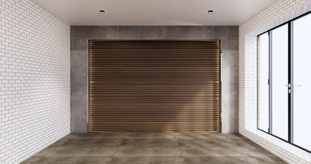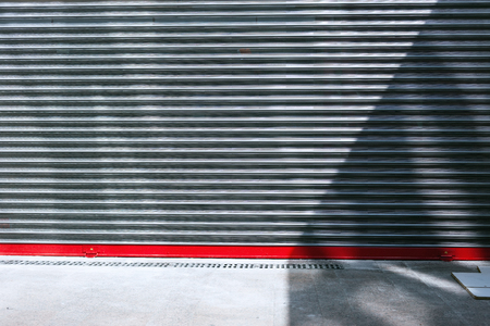 Old gray roller shutter gate on concrete wall with concrete tiles floor
