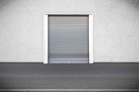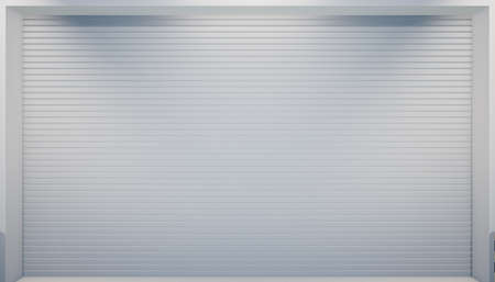 3d rendering of exterior roller shutter, metal door at front. Installation for security by roll up at opener, entrance of commercial, industrial building i.e. warehouse, factory.