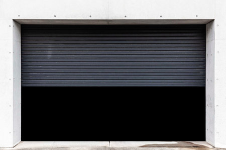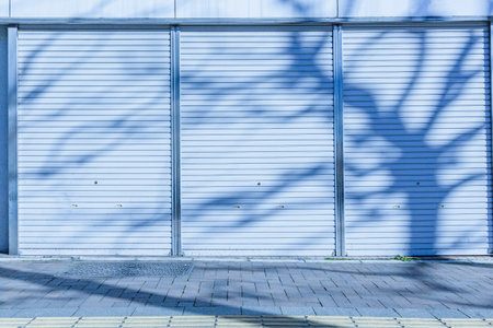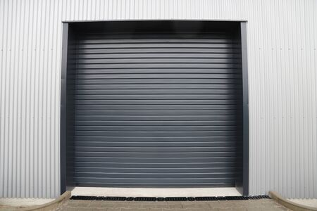 Warehouse gate, place of unloading and loading goods. Industrial place.Outdoor shot of warehouse, storage facility, hangers for garages with grey rolling gates.
