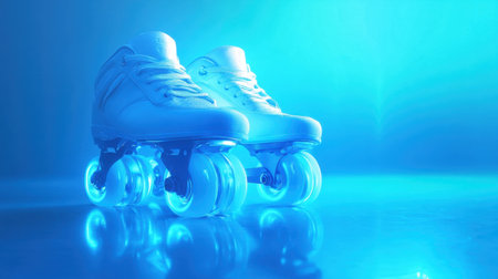 A captivating image of white roller skates with glowing wheels set against a mesmerizing blue light. The smooth surface reflects the vibrant colors, creating an energetic and lively atmosphere ideal for sports and leisure activities.