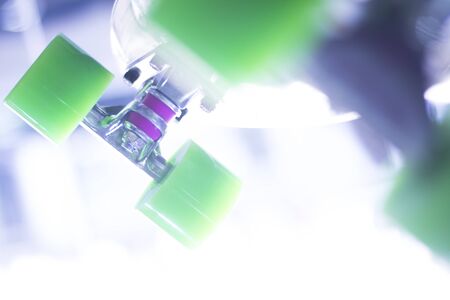 Skate board and wheels, axle and bearings in skates store on display in shop window on sale new and shiny.