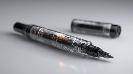 A modern clear fountain pen with an ink cartridge stands out against a white background, highlighting its fine tip design, perfect for artists and writers.