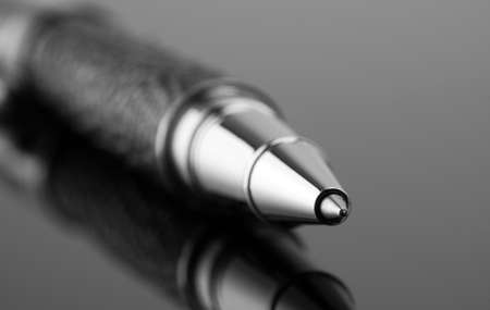 Close up picture of a tip of a black colored ball pen placed on top of a white isolated background