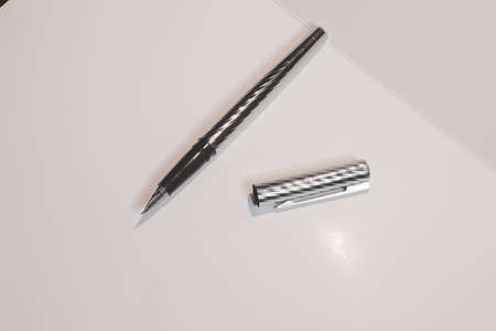 Top closeup shot of a pen with nib in focus shot on white surface and copy space for literacy concept
