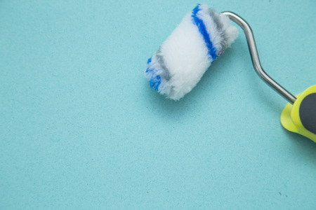Roller paint on a blue background. top view