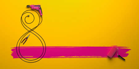 A yellow construction roller lies on a pink background. Tools for repair
