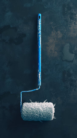 Blue paint roller on textured dark background