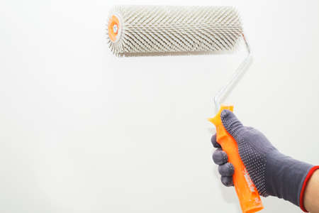 A hand in a red protective glove holds a paint roller against a light-colored wall. Mousing hand with a new hand tool. Painting services. Inside the room. Side view. Selective focus.