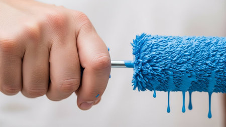 A close-up shot a hand gripping a blue paint roller with vibrant blue paint dripping from its textured surface onto...