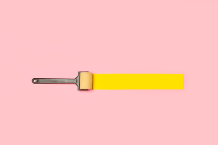 A paint roller and a yellow paper in the shape of a brush stroke on a pink background with copy space