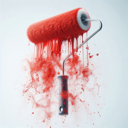 An image showing a red paint roller dripping and splattering, adding dynamic texture to a white background, reflecting the energy and intensity of the painted color and form.