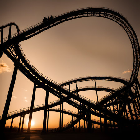 A roller coaster in a vibrant carnival park, capturing the thrilling action against the backdrop of a colorful sunset, A rollercoaster ride as an analogy of fluctuating inflation rates, AI Generated