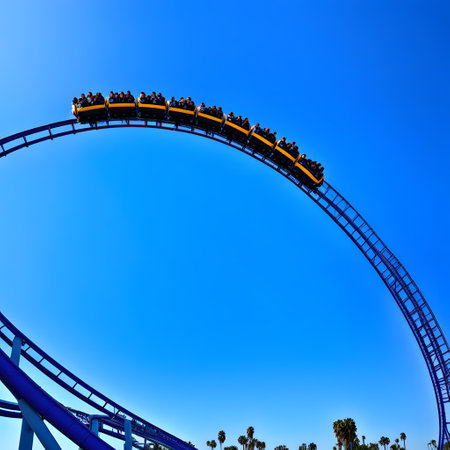 A roller coaster track twisting and turning against a blue sky, capturing thrill, excitement, and amusement park fun.