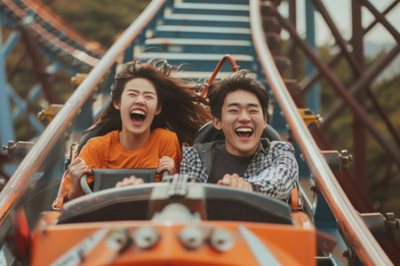 a fun, unforgettable roller coaster ride. two people vividly express their emotions from the chosen attraction