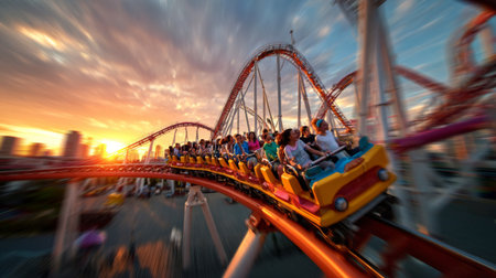 A captivating scene of an amusement park roller coaster ride featuring excited passengers amidst a beautiful sunset backdrop. The motion blur highlights the thrill and energy.