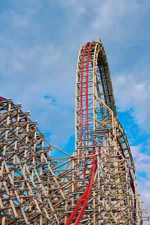 Blur The red and white roller coaster tracks alternate in the amusement park on a clear day.