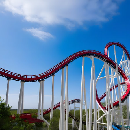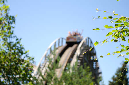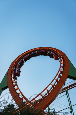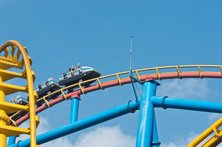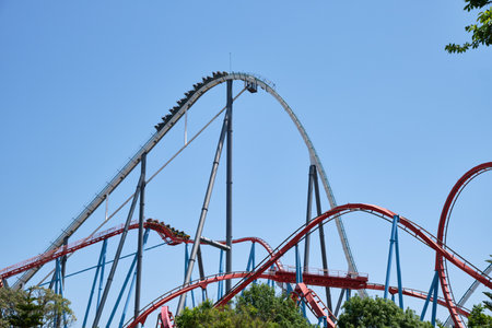 Valencia, spain - May 20, 2022: A tall, slender metal structure supports a fun roller coaster ride on a sunny summer day.