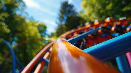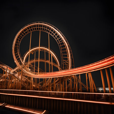 A stunning night image of a vibrant roller coaster with colorful lights and a sense of speed, encapsulating the thrill and excitement of an amusement park experience.