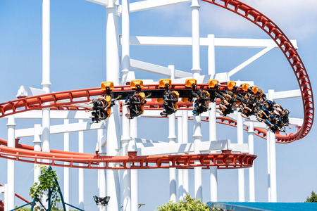 Orlando, Florida. July 18, 2019. Top view of people enjoying amazing Mako rollercoaster at Seaworld