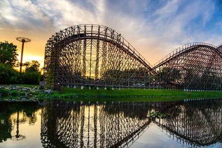 SHAKOPEE, MINNESOTA, USA - JUNE 22, 2016: The Wild Thing roller coaster and waterpark slides at Valley Fair theme park silhouetted against dramatic cumulonimbus clouds on a warm summer evening. Valley Fair opened in 1976 and features over 75 rides and att