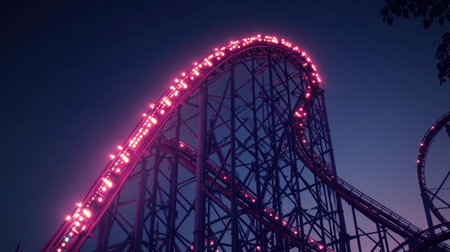 A stunning view of a roller coaster at twilight, adorned with vibrant neon lights, presenting a captivating scene of excitement and adventure in an amusement park.