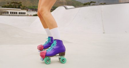teenager girl's legs wearing roller skates. partial view. teen girl rollerblading in the street. leisure and summer activity.