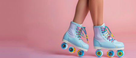 Vibrant 90s style: close-up of girl's legs in pink roller skates, against a blue wall, epitomizing retro coolness