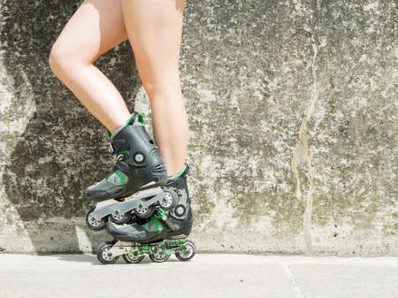 Woman slim legs wearing roller skates standing outside. Sport activity objects concept.
