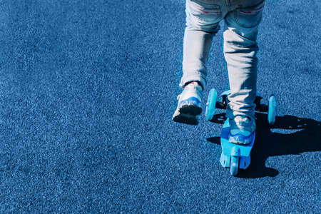 Boy in gray pants and sneakers riding on blue kick scooter on Special paving. Kids play outdoors. Active leisure and outdoor sport for children. Blue classic color