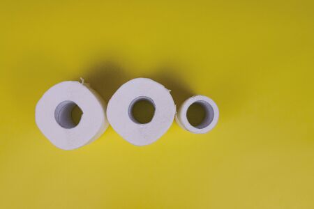 Three rolls of toilet paper on yellow background. Toilet paper crisis due to coronavirus COVID-19 quarantine. Close-up shallow depth of field