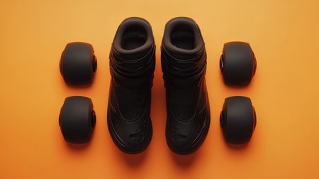 Close-up of black roller skates paired with wheels on a vibrant orange background. Perfect for illustrating active lifestyle, sports passion, and fitness pursuits.