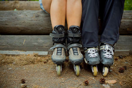 Closeup of people friends with roller skates. Woman and man relaxing outdoor.