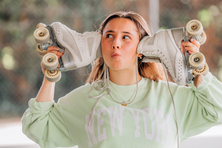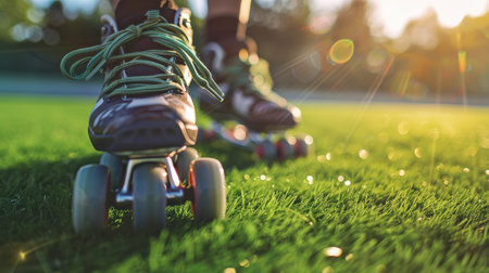 Close up of a womans feet wearing bright retro roller skates. Generative ai