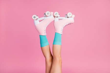 Cropped profile side view of nice attractive lovely feminine long legs wearing blue sock brandy fashionable skates isolated over pink pastel color background