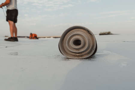A man's foot in a roller skate stands on the asphalt at sunset in the summer in the city.