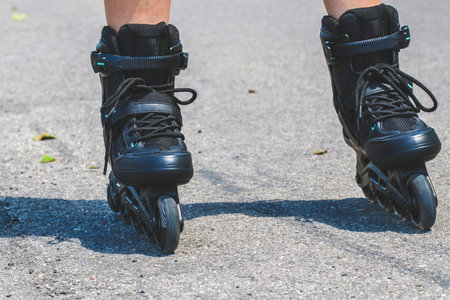 Close up of inline roller skates with blue wheels. Extreme sport. Concept about sport and leisure. Sport lifestyle. Fun time activity